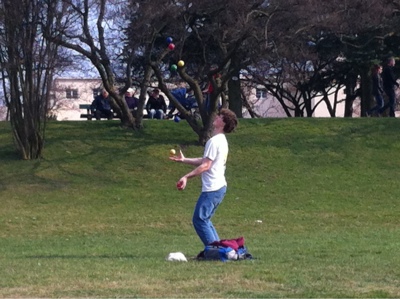 Dann erscheint ein junger Mann und beginnt mit 7 Bällen zu jonglieren. Bemerkenswert!