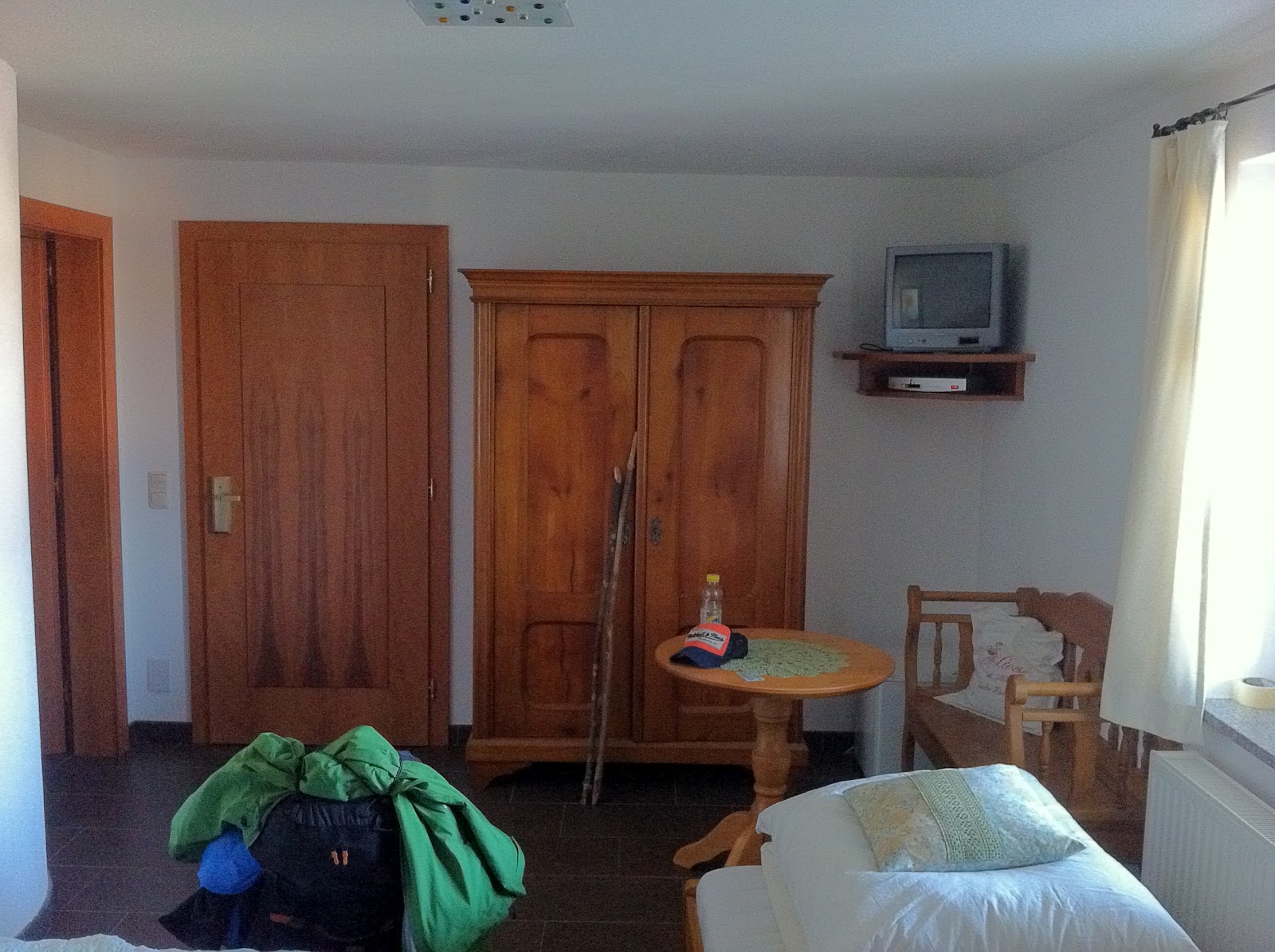 Gegen 16Uhr, kurz vor meinem Tagesziel, erreiche ich eine Infotafel auf der alle Gasthöfe in der Nähe aufgelistet sind. Ich wähle ein paar Nummern und schon bei der 2ten habe ich Erfolg.